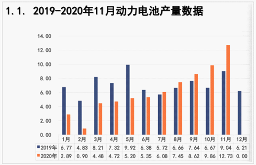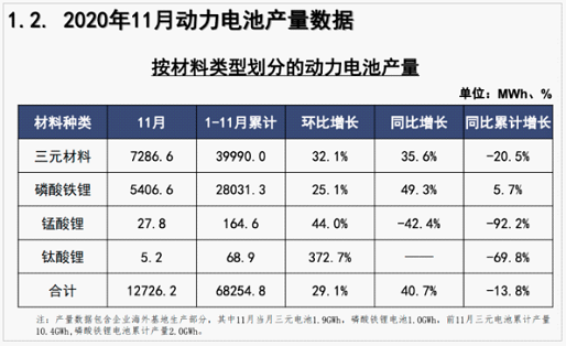 另外,中国汽车动力电池产业创新联盟发布的数据显示,11月,我国动力电池产量共计12.7GWh,同比增长40.7%,环比增长29.1%。其中三元电池产量7.3GWh,占总产量57.3%,同比增长35.6%,环比增长32.1%;磷酸铁锂电池产量5.4GWh,占总产量42.5%,同比增长49.3%,环比增长25.1%。1-11月,我国动力电池产量累计68.3GWh,同比累计下降13.8%。其中三元电池产量累计40.0GWh,占总产量58.6%,同比累计下降20.5%;磷酸铁锂电池产量累计28.0GWh,占总产量41.1%,同比累计上升5.7%。